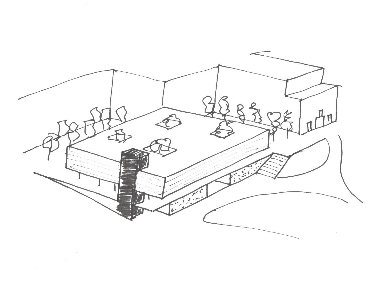 Famous patios have great importance in the project idea, so much so that can be summarized, patios, orange and views, according to the existing and the situation. 4 levels make up the project. The lower semi-buried and contains access offices and restaurants, The top simply forms a public and open floor space that provides shelter and views on the new renovated space in the city. The main level houses where residences are distributed under cheered courtyards with orange trees in the area. And the upper level where lie the recreational areas of the residences.